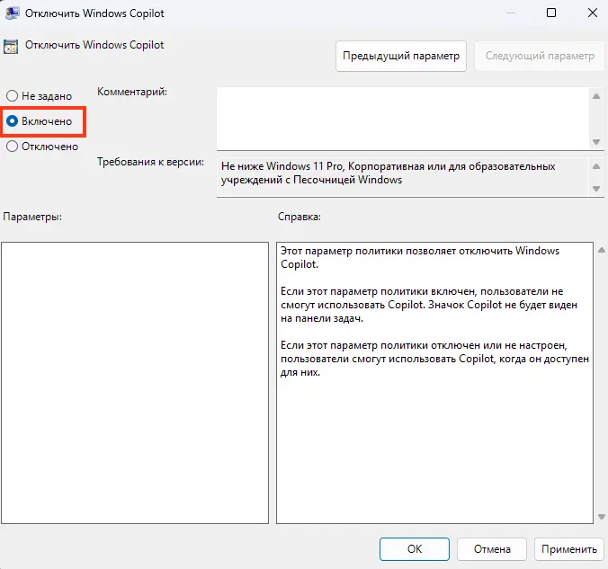 — Описание: Установка политики в состояние «Включено» полностью блокирует доступ к Copilot, и значок исчезнет с панели задач.