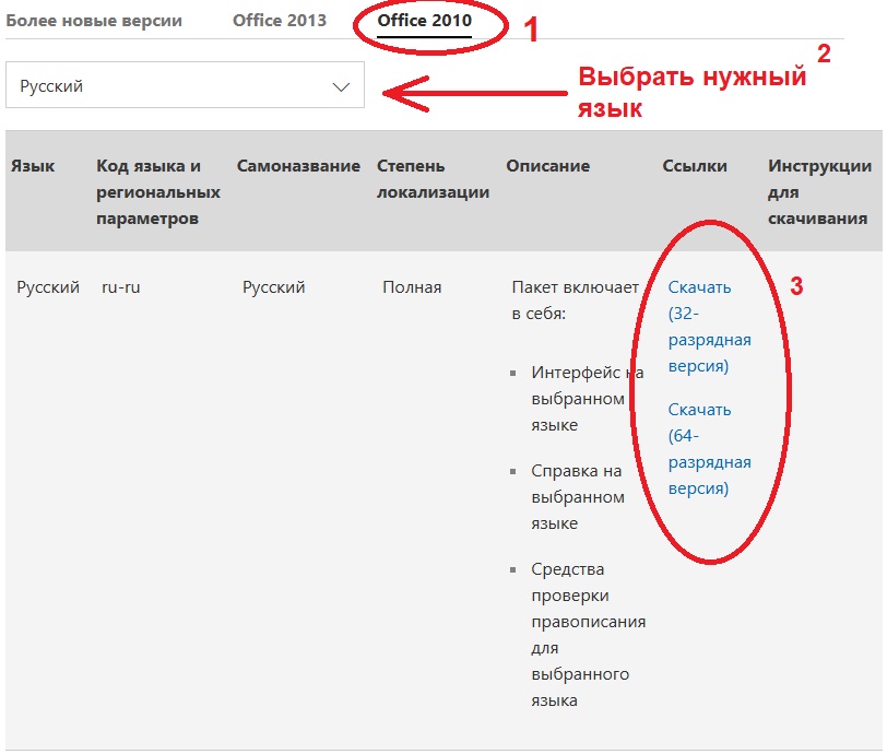 На самой странице с языковым дополнением выбираем вкладку «Office 2010», после в выпадающем меню выбираем нужный Вам язык, к примеру «Русский». Далее выбираем разрядность дополнения, к примеру х64 (обычно х64). И скачиваем его.