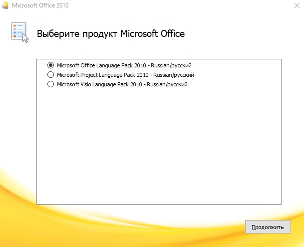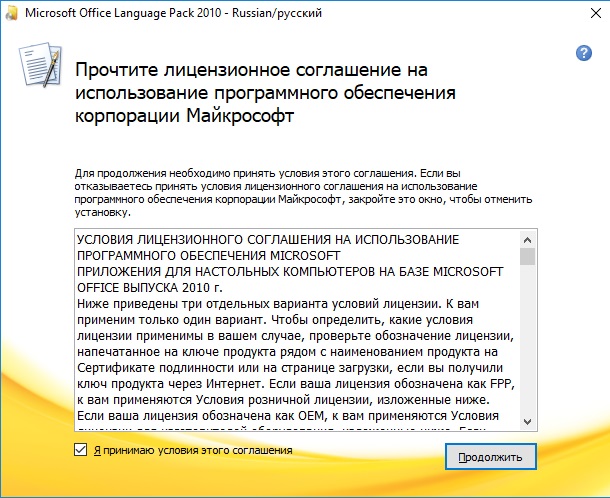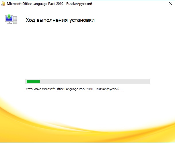6) Запускаем скаченное языковое дополнение, далее будет почти как при установке дистрибутива Microsoft Office 2010, только без ввода ключа.