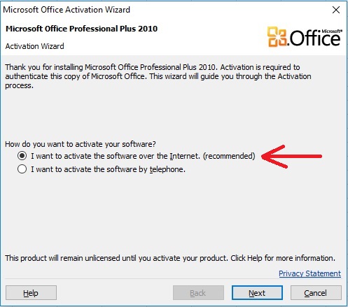 4) После того, как установка завершилась, переходим в любое приложение Microsoft Office 2010. При первом входе у Вас запросит активировать через интернет, или по телефону. Выбираем рекомендованный «через интернет».