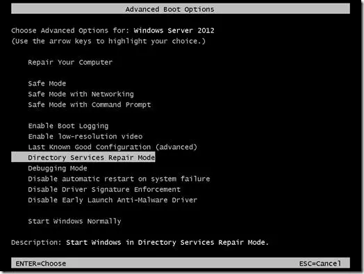 1. Перезагрузите вышедший из строя сервер. Во время загрузки нажмите F8 (для старых ОС) или используйте bcdedit / msconfig для входа в режим восстановления служб каталогов (DSRM).