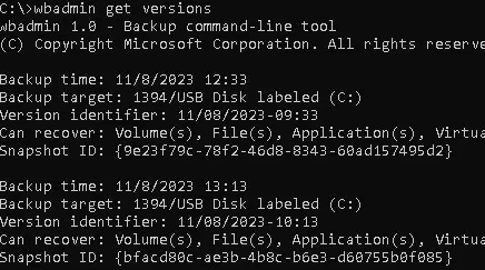 4. Выполните команду wbadmin get versions чтобы увидеть список доступных резервных копий.