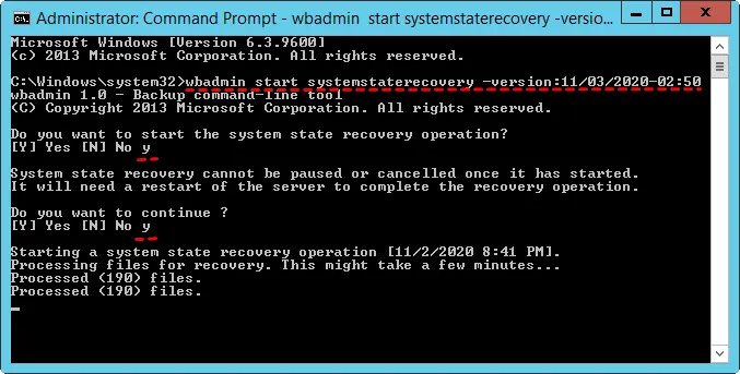 5. Запустите процесс восстановления, используя wbadmin start systemstaterecovery