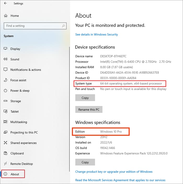 In the next window, go to «About» on the left, and you can find out the system architecture and version of Windows.