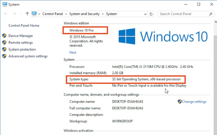 In the «System» window, you can find out the version (release) of your Windows and the system architecture.