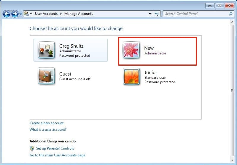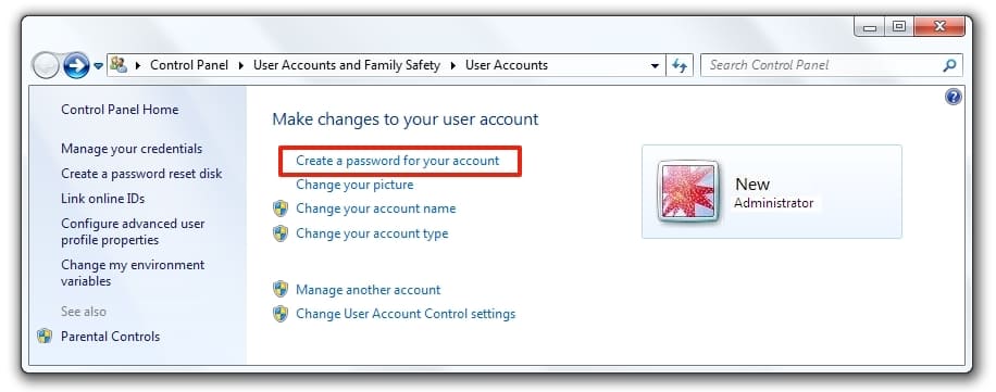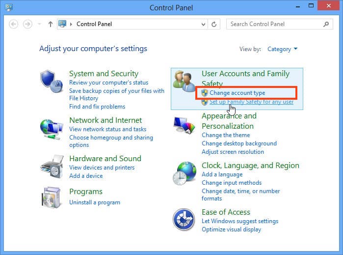 Firstly, let’s access the user account editing menu in Windows 7. Go to «Start» => Control Panel => User Accounts and Family Safety (if viewing in «Category» mode => Change account type.
