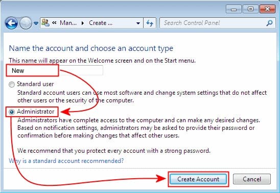 Specify the name of the new user and assign them rights. Depending on the rights you want to grant the user, select either «Standard User» or «Administrator.» In this example, let’s choose «Administrator» so that I can modify system settings and make any changes to it (installation, uninstallation of programs). After selecting the rights, click «Create Account.»