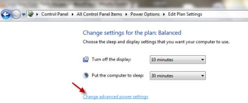 Optionally, set the display turn-off time. Then go to «Change advanced power settings».