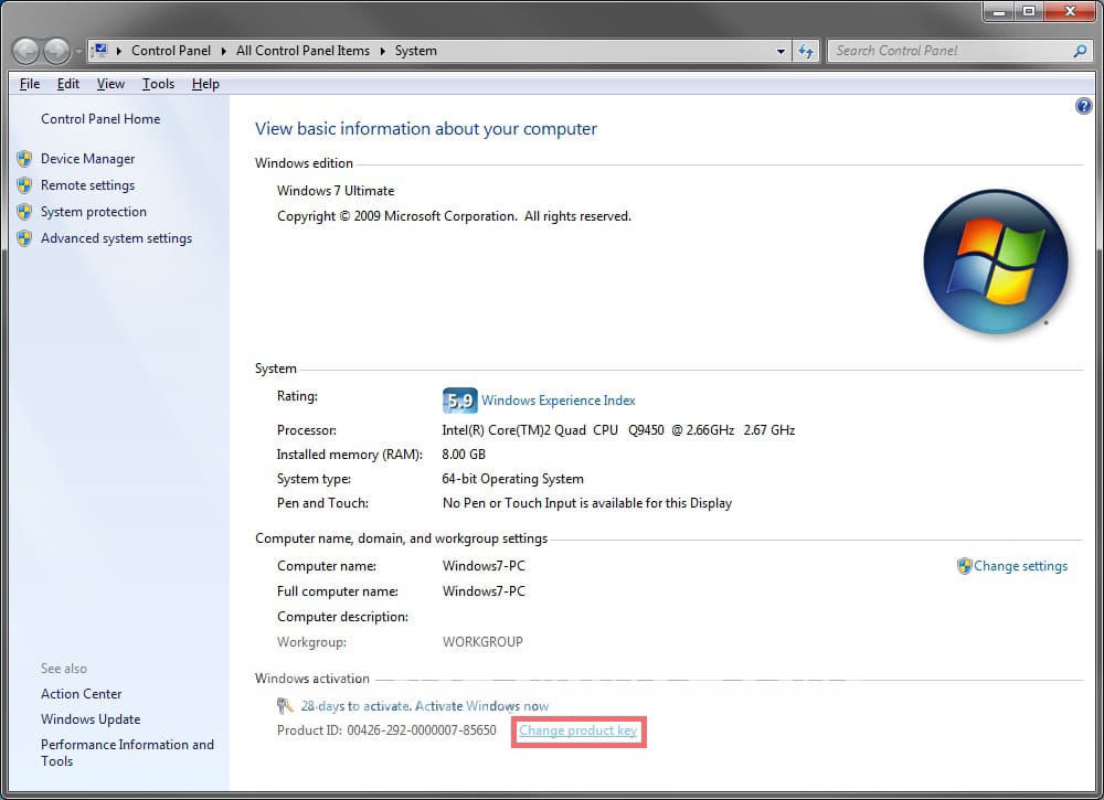 To activate, go to the «System Property» menu and click on «Change product key».