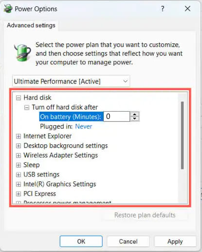 — Turn off hard drive after: 0 min (zero minutes means never)