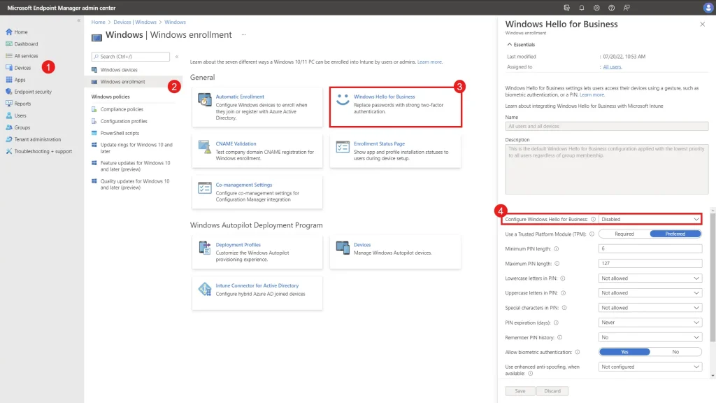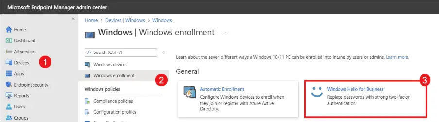 Devices → Windows → Enrollment → Windows Hello for Business