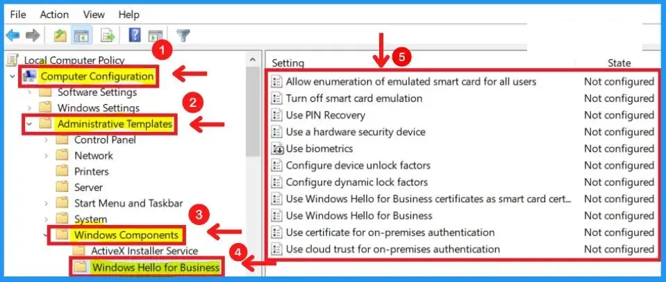 Computer Configuration → Administrative Templates → Windows Components → Windows Hello for Business