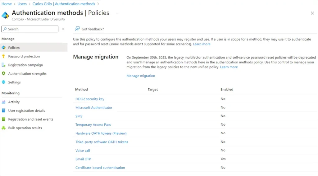 2. Настройте Azure AD MFA в админцентре Entra: Security → Authentication methods → Policies.