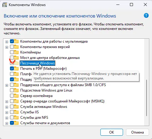 Windows Sandbox не отображается в списке компонентов:
