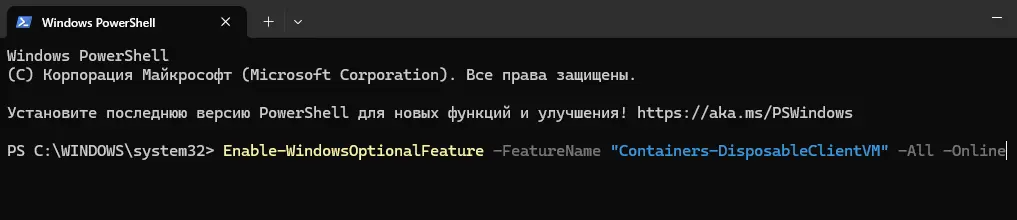 PowerShell (запустите как администратор):Enable-WindowsOptionalFeature -FeatureName "Containers-DisposableClientVM" -All -Online