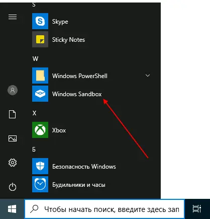 1. После включения найдите в меню Пуск приложение «Windows Sandbox» и запустите его.