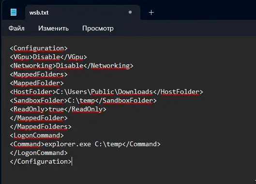 — Как использовать: сохраните файл с расширением .wsb (например Downloads.wsb) и дважды кликните по нему — Windows автоматически запустит Sandbox с указанными параметрами.