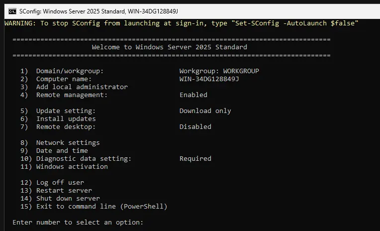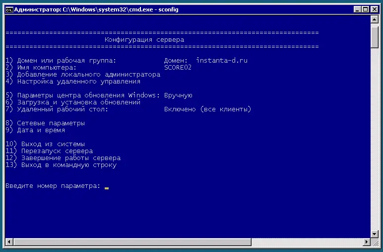 После установки система загружается в текстовую консоль. Первое, что стоит сделать — запустить встроенное средство sconfig, позволяющее выполнить базовую настройку сервера через простое меню.