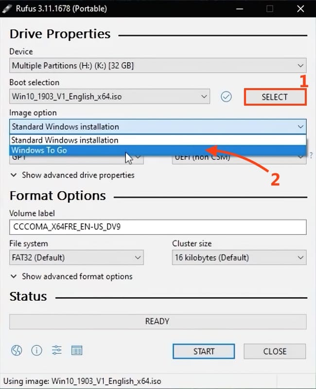 — In the «Image options» dropdown menu, select «Windows To Go».