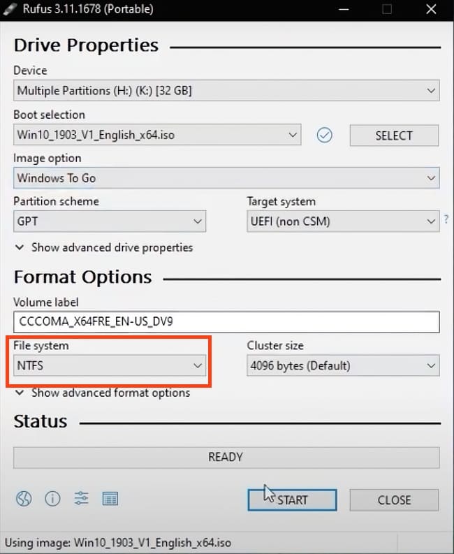 — Choose the «NTFS» file system.